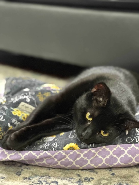 Because of his condition, the staff and volunteers tailored his environment to keep him safe. He was eventually given his own padded enclosure filled with blankets, pillows, and mats to soften any tumbles. During the day, he roamed the center to stretch his legs and work on his dexterity. And over time, he became a fixture at HOPE. Staff and volunteers greeted him daily; visitors stopped in just to meet the wobbly black cat they had heard so much about.