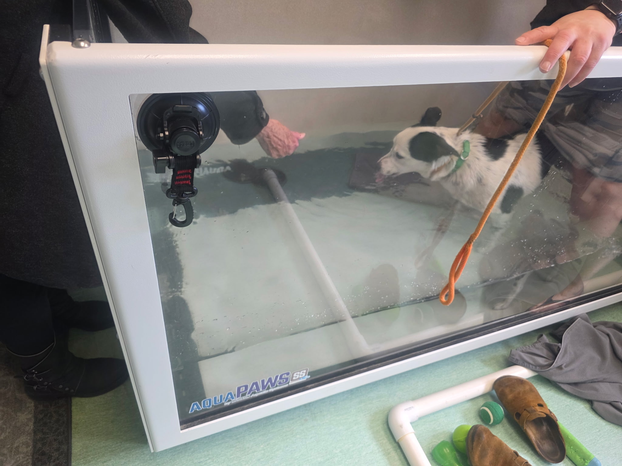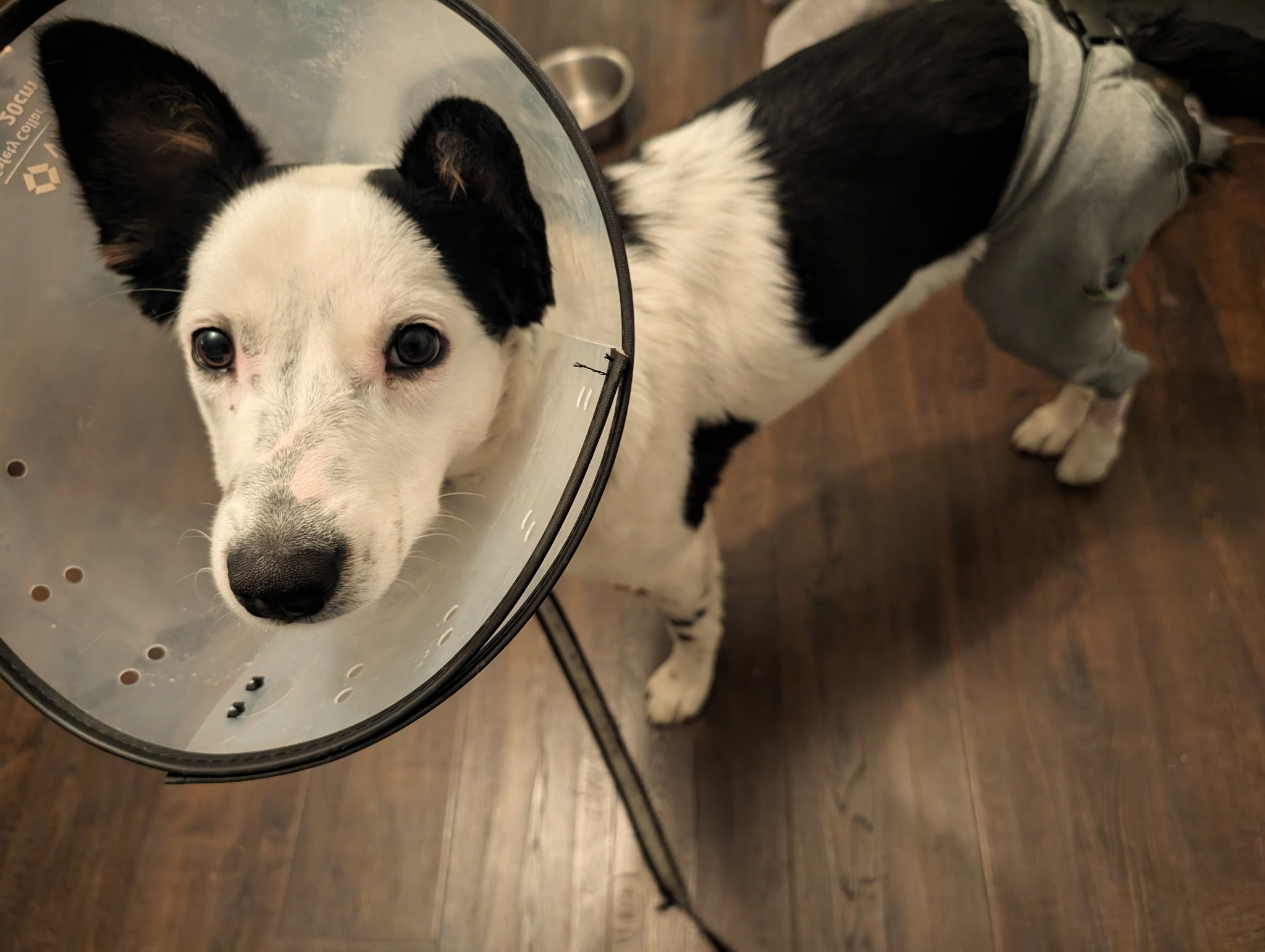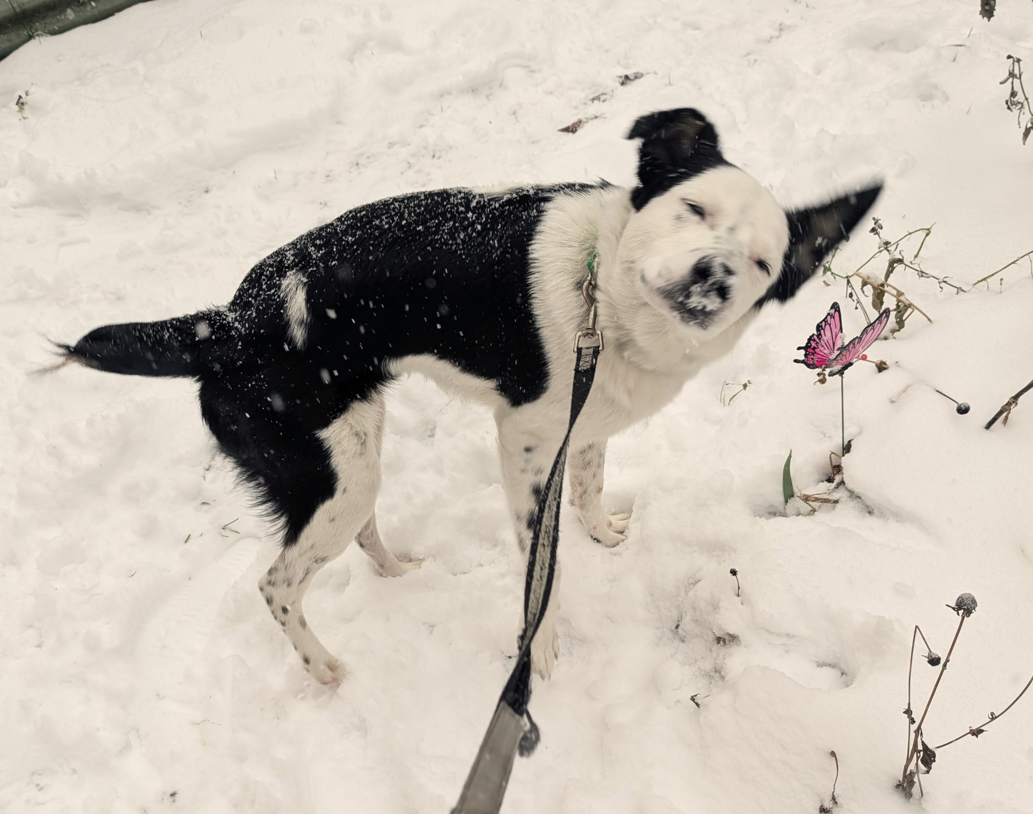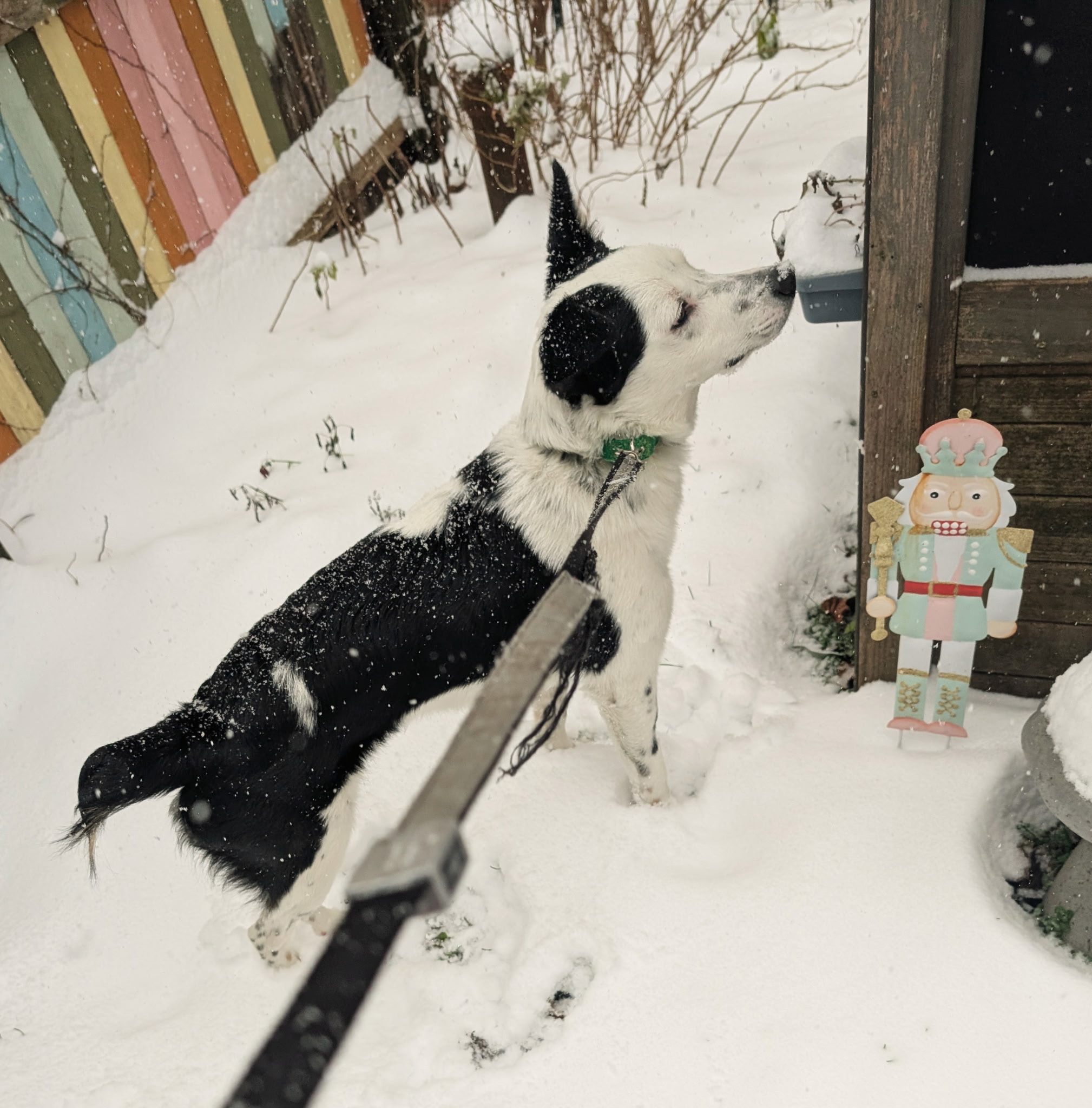 Stitch began hydrotherapy on November 19th, 2025 and has been steadily building strength through structured leash walks and stair work. He is now off all pain medication and absolutely crushing it at his twice-weekly rehab sessions. He even got to experience his first snowfall recently—the joy on his face was unforgettable.